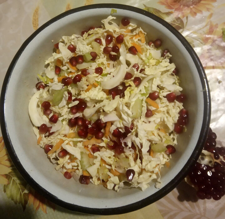 Капусту (савойскую или пекинскую) и стебли сельдерея тонко нашинковать, морковь и немного корня пастернака натереть на крупной тёрке, добавить зерна граната и немного зелени по вкусу.