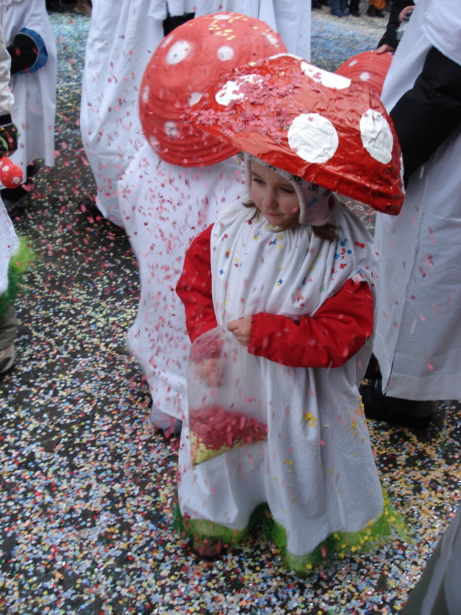 Для тех кто не умеет особо шить – вот неплохая идея детского карнавального костюма. Не обязательно только карнавального, для любых праздников. Это я усмотрел на швейцарских зимних карнавалах.