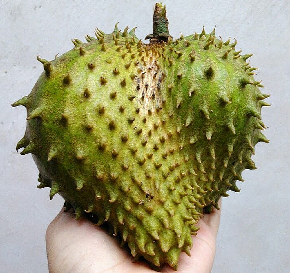 Плоды этого красавца имеют несколько названий, одно из самых распространённых — Сметанное Яблоко. За «сметану» надо благодарить отечественного покупателя, при этом в наших краях его перемежают с бразильским названием: Гравиола, или Гуанабана. Между прочим, продаётся по цене от 80 до 600 рублей за честный килограмм.