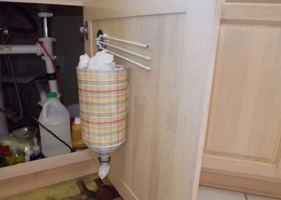Большие пакеты с ручками можно складывать в пластиковую бутыль с отрезанным дном. Ее рекомендуется прикрепить к стенке за прорезанное с одной стороны ушко. Сделанную из пластика емкость можно спрятать в сшитый из ткани или связанный крючком яркий чехол. Тару ставят на подоконник или в ящик стола.
