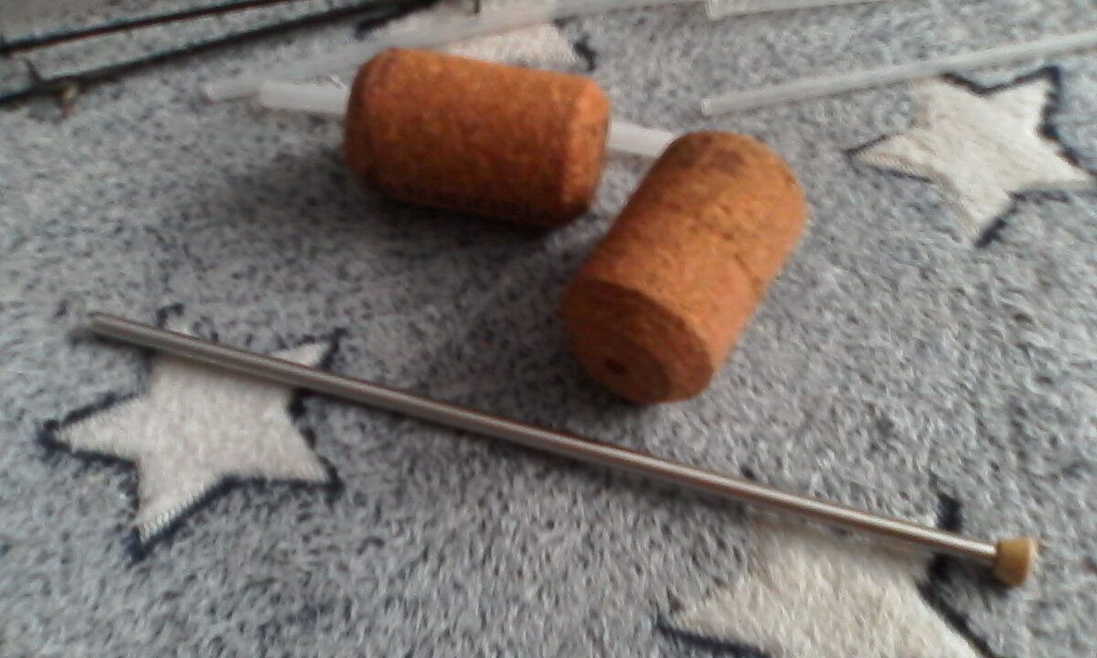 Обрезаете скошенные края пробок после варки. Делаете отверстия по середине пробок. Можно протыкать первоначально с обеих сторон пробки.Сначала можно примериться и без антенны. Надеваете на антенну и подгоняете. Можно их покрутить по месту. Смотрите, где ещё подрезать или убрать неровности.