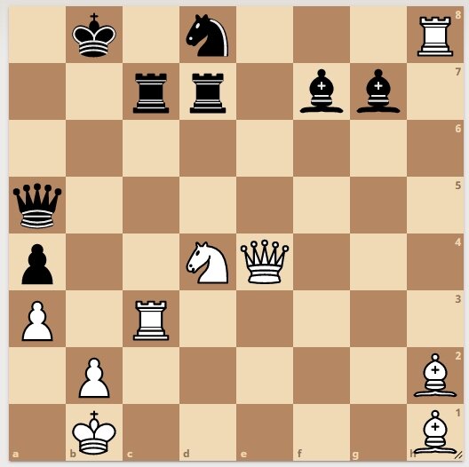 Очередная шахматная задача. В материальном плане у белых всего лишь лишняя пешка. Однако у белых под боем конь и ладья на h1, а у черных под боем ладья на с7. Все может измениться в материальном плане. Но белые начинают и ставят мат всего в один ход.