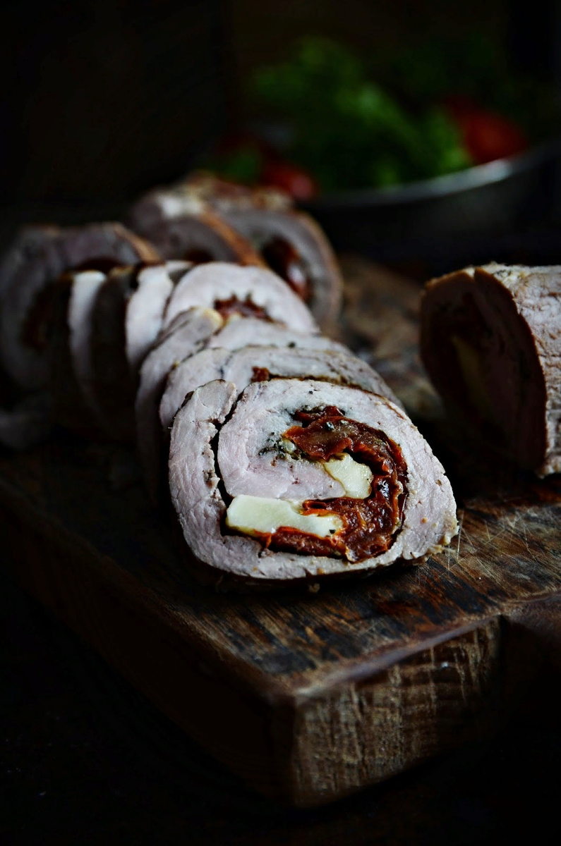 Филе смазываем солью, перцем и провансальскими травами. Укладываем по центру помидоры и нарезанный на небольшие кусочки сыр моцарелла, после чего скручиваем все в рулет достаточно тесно. Скрепляем получившийся рулет зубочистками.