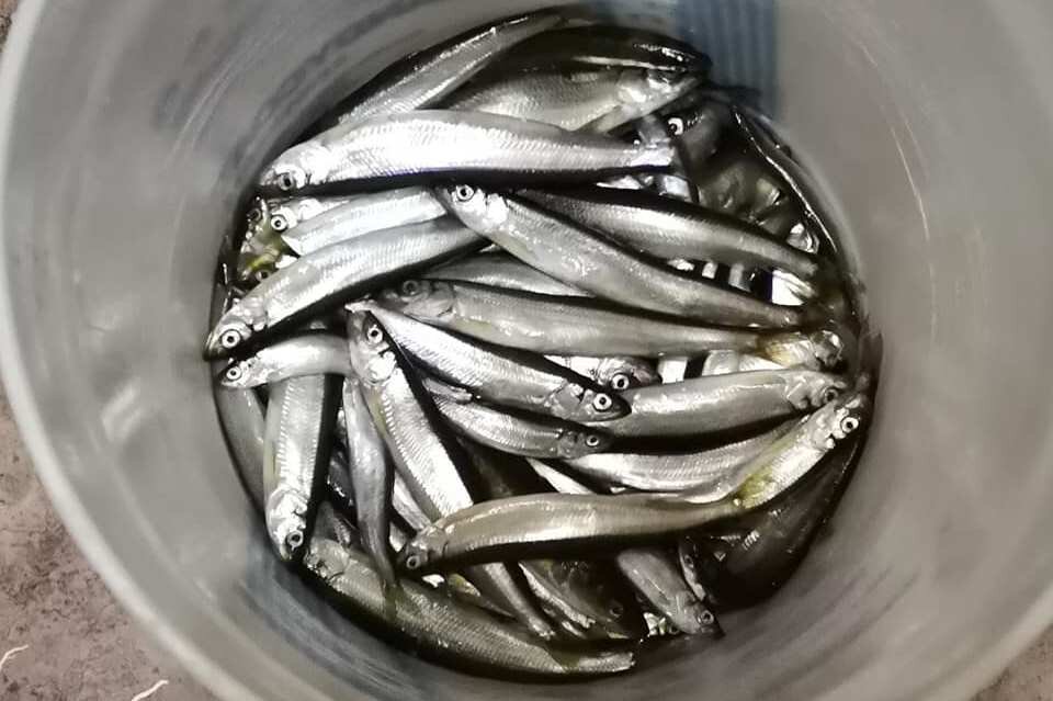Корюшка — еде сезонная, ловить корюшку из-подо льда у нас ездят в Головнино — на южный конец Кунашира. И вот оно — ведро свежей рыбы. Первая корюшка в доме в этом году.