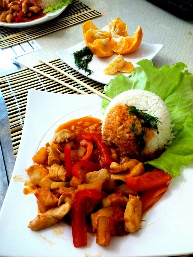 3) Обжарить курицу, соединить с соусом и потушить еще минут 10. Подавать с рисом.