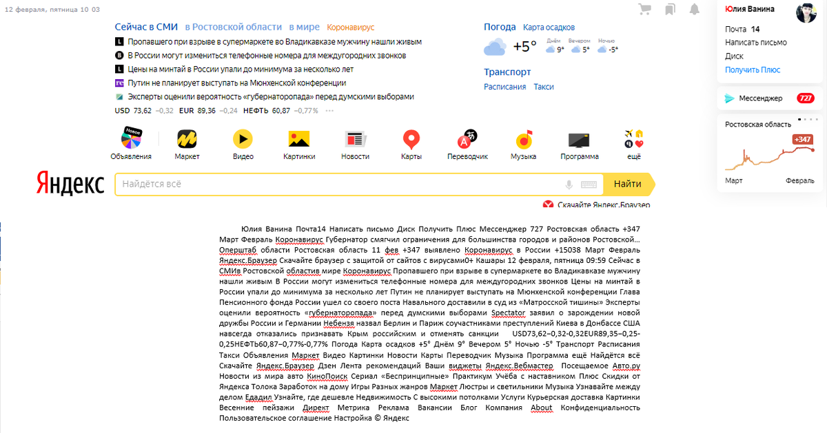 Сегодня за исходный текст взят стартовая страница из Яндекса.