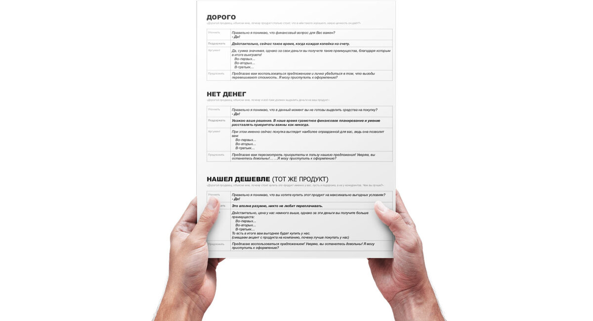 На Портале проекта "Вооружение отделов продаж" выложены новые примеры отработки возражений по авторской 4-х шаговой методике Максима Батырева. Суть её в том, чтобы расслабить, поддержать и сделать клиента героем. И только после этого применять аргументы.