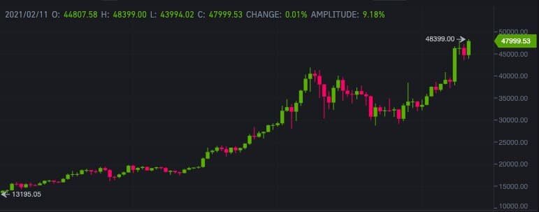 Π‘ Π½Π°ΡΠ°Π»Π° Π³ΠΎΠ΄Π° Π±ΠΈΡΠΊΠΎΠΈΠ½ ΠΏΠΎΠ΄ΠΎΡΠΎΠΆΠ°Π» Π½Π° 69%. ΠΠΎΡΠ»Π΅Π΄Π½ΡΡ Π²ΠΎΠ»Π½Π° ΡΠΎΡΡΠ° ΡΡΠΎΠΈΠΌΠΎΡΡΠΈ ΠΊΡΠΈΠΏΡΠΎΠ²Π°Π»ΡΡΡ Π½Π°ΡΠ°Π»Π°ΡΡ ΠΏΠΎΡΠ»Π΅ ΡΠΎΠ³ΠΎ, ΠΊΠ°ΠΊ Π°Π²ΡΠΎΠΏΡΠΎΠΈΠ·Π²ΠΎΠ΄ΠΈΡΠ΅Π»Ρ Tesla ΠΎΠ±ΡΡΠ²ΠΈΠ» ΠΎ ΠΏΠΎΠΊΡΠΏΠΊΠ΅ Π±ΠΈΡΠΊΠΎΠΈΠ½ΠΎΠ² Π½Π° $1,5 ΠΌΠ»ΡΠ΄. Π ΠΊΠΎΠΌΠΏΠ°Π½ΠΈΠΈ Π΄ΠΎΠ±Π°Π²ΠΈΠ»ΠΈ, ΡΡΠΎ ΠΏΠ»Π°Π½ΠΈΡΡΡΡ ΠΎΠ±Π΅ΡΠΏΠ΅ΡΠΈΡΡ Π²ΠΎΠ·ΠΌΠΎΠΆΠ½ΠΎΡΡΡ ΠΎΠΏΠ»Π°ΡΡ Π°Π²ΡΠΎΠΌΠΎΠ±ΠΈΠ»Π΅ΠΉ Π±ΠΈΡΠΊΠΎΠΈΠ½Π°ΠΌΠΈ.