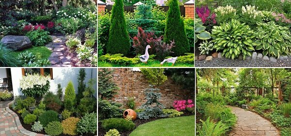Величественные композиции с участием тенелюбивых можжевельников, туй, елей и прочих декоративных хвойных — беспроигрышный вариант! Чтобы оживить зеленую «лесную» композицию, можно добавить камни, амфоры и островки теневыносливых цветов.