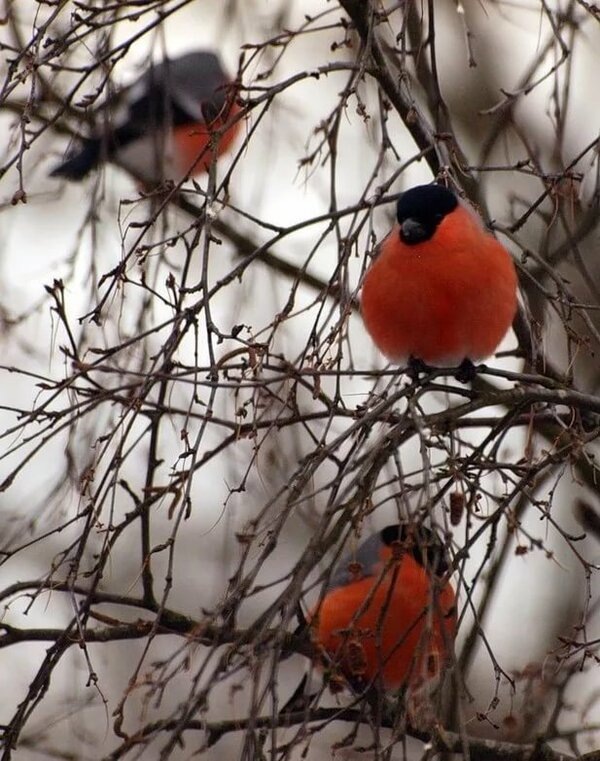 В нашем городском сквере растёт дерево, на котором сохраняются с осени семена-крылатки. Зимой к этому дереву слетаются птички. В середине зимы прилетают к дереву снегири, полакомиться семенами. Снегири стайные птички, и прилетев, дружно рассаживаются на ветках. Смотришь на дерево и видишь зимний пезаж с яблочками, это грудки птичек аллеют на ветках.