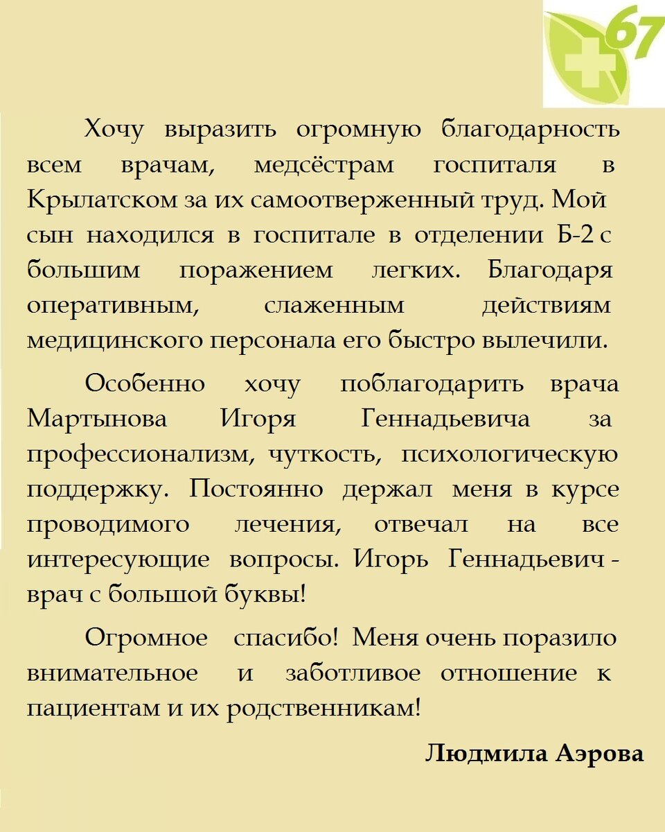 Мы продолжаем получать благодарности от пациентов госпиталя в Крылатском и их родных.