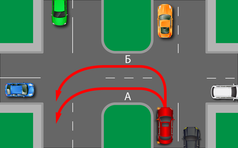 Вы едите по дороге которая разделена газоном и вы хотите развернутся. Перекресток для разворота не самый простой. По какой траектории вы поедите?