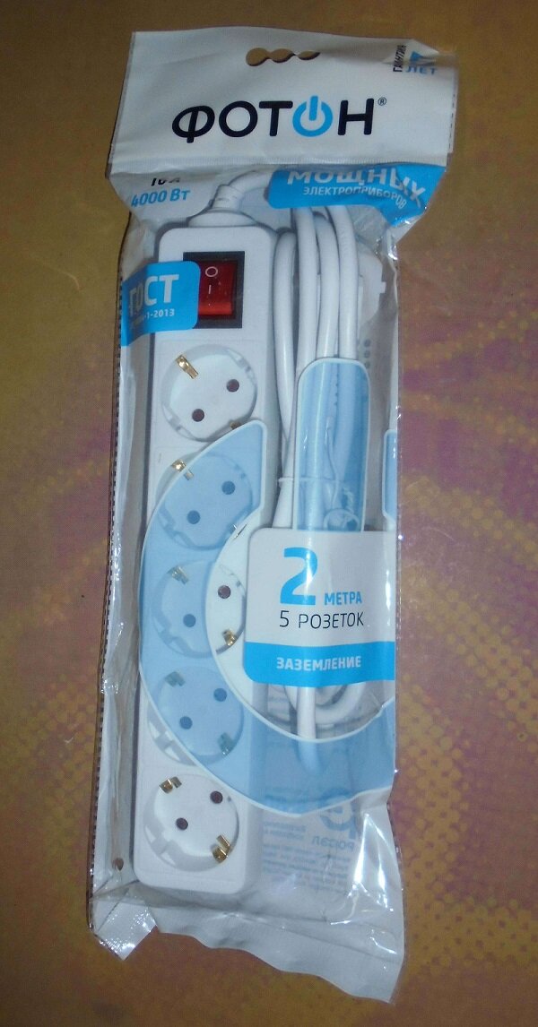 Сетевой удлинитель «ФОТОН» поставляется в заводской упаковке, на обратной стороне которой приведены основные технические данные устройства и обозначены его конкурентные преимущества.
