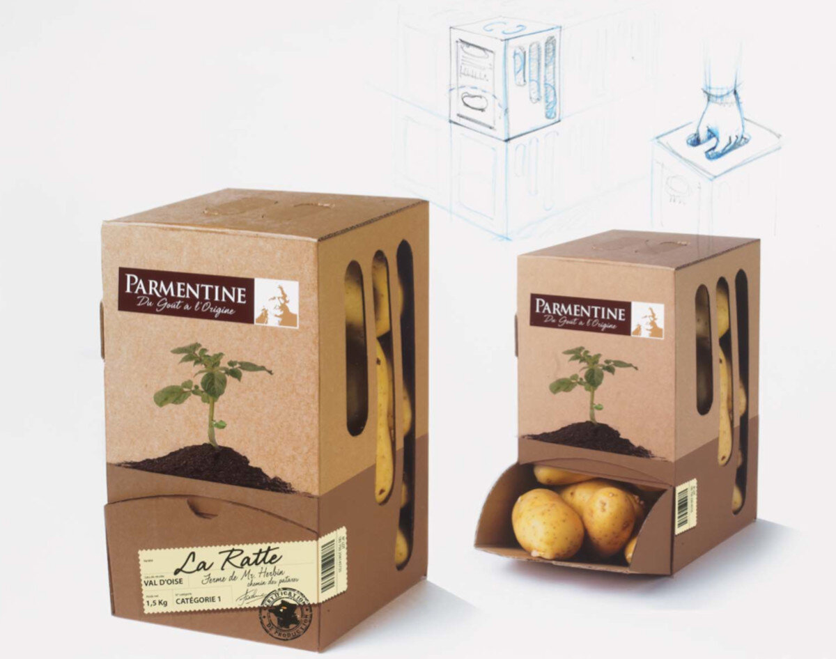 Дизайнер из Франции Violaine Kermoal разработала конструкцию коробки-сумки, а заодно и диспенсера для упаковки и хранения картофеля бренда Parmentine.