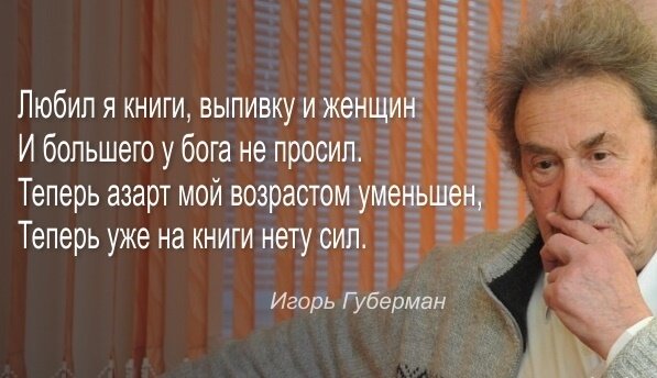 84-летний Игорь Губерман принимает свой возраст со здоровым цинизмом и самоиронией. И другим советует. Если нельзя этого избежать, значит, нужно расслабиться и попытаться получить удовольствие: