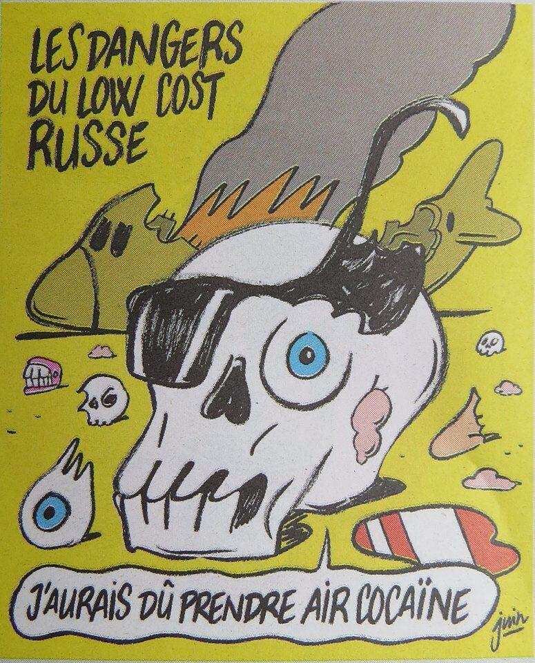 Второй комментарий Шарли Ёбдо – подпись к карикатуре "Опасности российских лоукостов". На нем большой человеческий череп с живыми глазами. На заднем плане — останки человеческих тел и лужа крови. Фоном всему — остов горящего самолета.