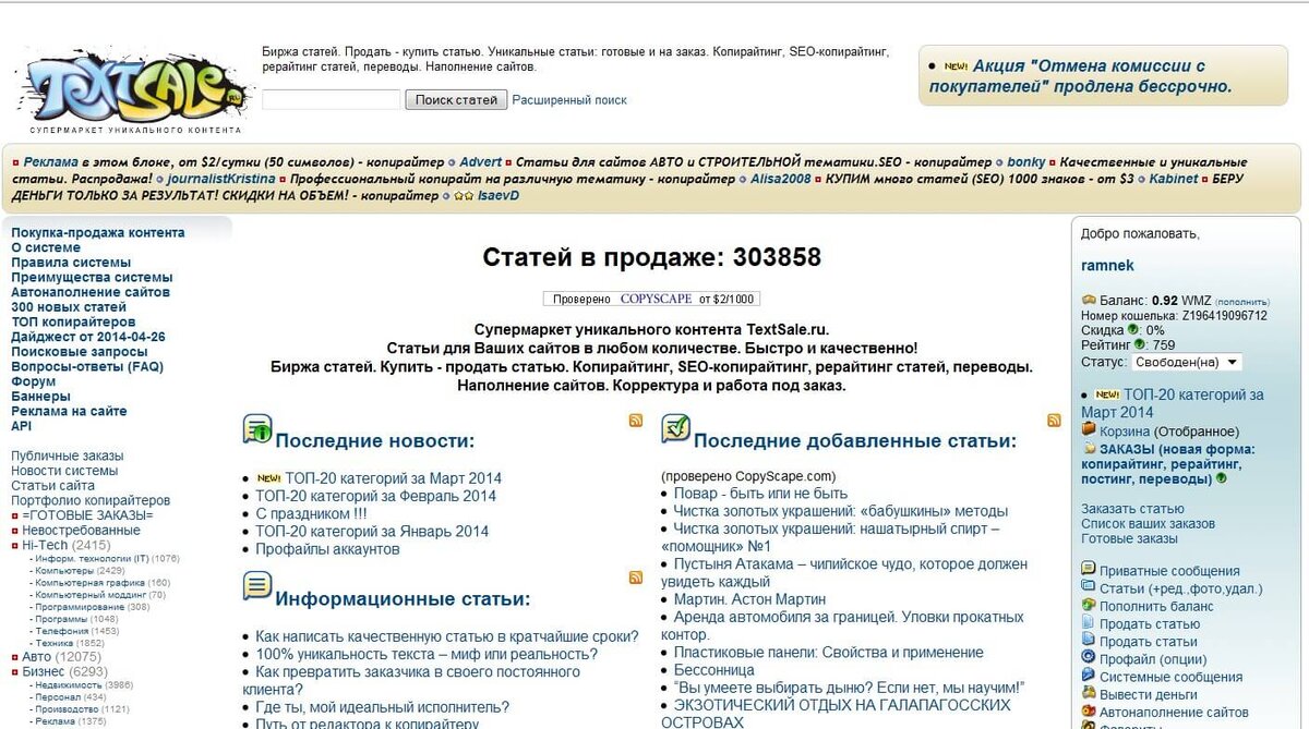 В принципе, насчет выбора биржи статей должен задумываться отнюдь не новичок, а опытный специалист, ведь новичку все равно начинать с самых низов, а профессионал сможет всегда доказать свой высокий уровень. Итак, приступим к рассмотрению некоторых бирж копирайтинга, на которых потенциальный автор может остановить свой выбор. Самой популярной и востребованной биржей статей на сегодняшний день является Textsale. Биржа статей Textsale пусть и расположена в поиске Яндекса отнюдь не на первых, и даже не на вторых ролях, является лидером по числу пользователей и количеству продаваемых статей, которые весьма высокого качества. Принцип, по которому копирайтеры выбирают эту биржу статей понятен, где хорошие условия для работы, туда и стоит пойти. Пользователей на этой бирже почти 60 тысяч человек, это о чем-то да говорит. Цены на контент тут самые разные, варьируются от 0, 6$ за тысячу и выше.