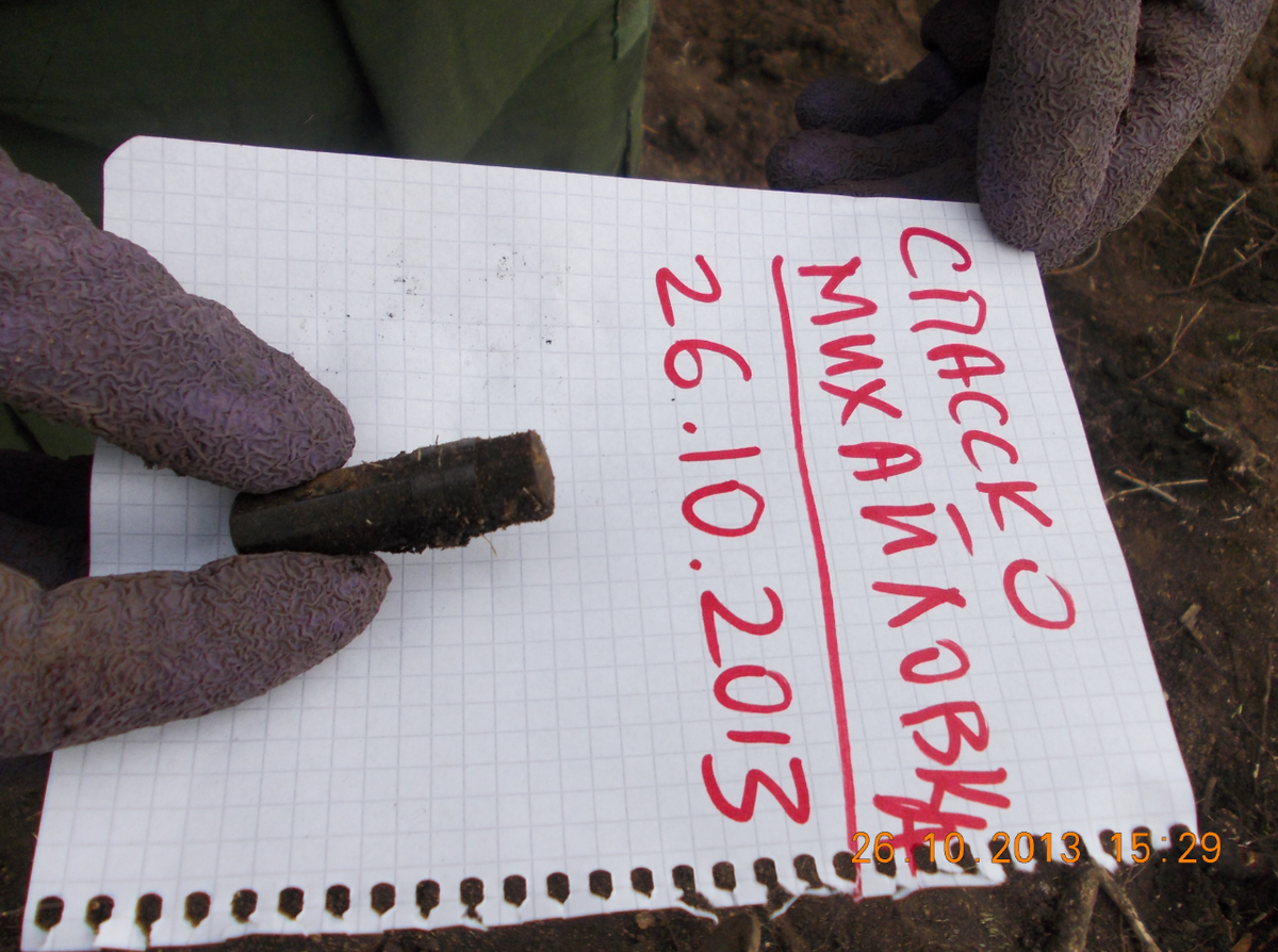 Боеприпасы патроны и другое военное имущество обнаруженное при проведении поисковых полевых работ передано сотрудникам МЧС и МВД Александрповского района на утилизацию и уничтожено 6.11.2013 согласно акту 328/11/13/640