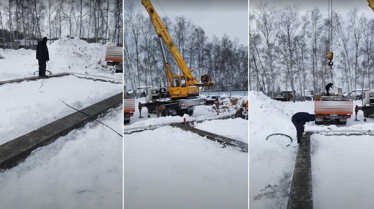 10 февраля заранее почистили фундамент от снега, чтобы 11-го с утра начать монтаж. И вот же засада. Ночью выпал снег, а фундамент целлофаном мы не накрыли. Снег частично растаял, фундамент покрылся коркой льда, с которой мы боролись ломами, топорами и газовой горелкой. Потеряли приличное количество времени, ведь кран и плиты пришли вовремя. Поэтому решили для начала почистить только в местах опоры плит.