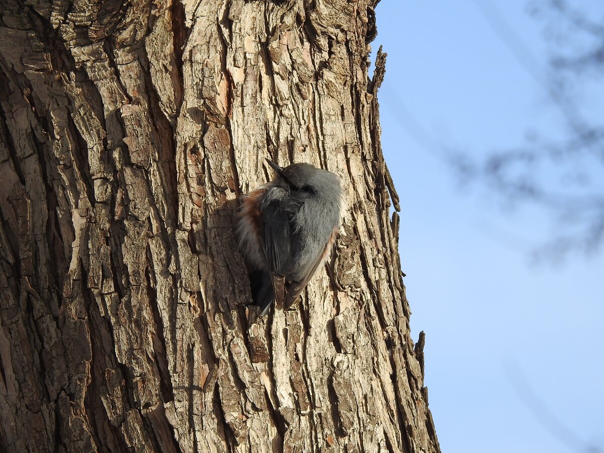 Поползень и правда ни на кого не похож — есть в нем что-то детское, птенцовое — при всей его деловитости и хозяйственности. Наверно, такое впечатление он производит потому, что хвостик у него такой короткий, словно еще не вырос, а голова большая и переходит в туловище. Сверху поползень серо-голубой, брюшко белое, через глаз проходит черная полоса, а подхвостье и бока словно кровью испачканы. На днях в инстаграме выложила фото, как поползень в морозную и ветреную погоду распушился, а одна подписчица мне пишет: «Что с ним? Бочок в крови, нахохлился! Как жаль его! и ведь не дастся для помощи! Ужас». А ведь помощь поползню не нужна — кроме продовольственной, конечно, в виде семечек и сала.