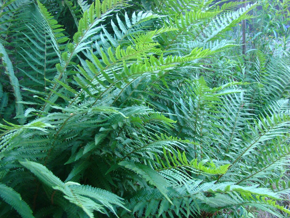 Большая группа родных папоротников растет дальше по склону. Они пережили оползень, строительство подпорной стенки, глину. Удивительно хороши были в прошедшем сезоне. В подбивку к ним я посадили хосты с нежными зелеными листьями и монетницу желтолистную (вербейник). Еще несколько разных папоротников растут на склоне, где будет сад хост, у крутой лесенки парочка домашних растет. Таким образом, весь склон в объятиях папоротников.