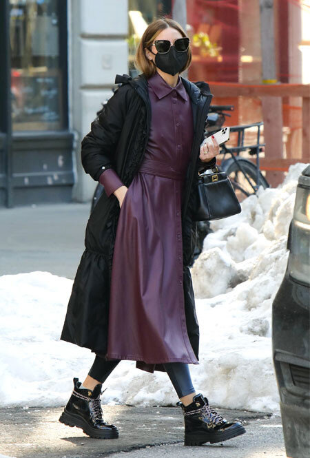 Оливия Палермо нередко появляется на публике и всегда предлагает публике какой-нибудь новый и неожиданный прием. Недавно она продемонстрировала, как носить зимой платье так, чтобы не замерзнуть и выглядеть актуально. Оливия решила взять за основу кожаный вариант винного цвета и дополнить его лосинами, длинным пуховиком-макси и ботинками-хайкерами.
