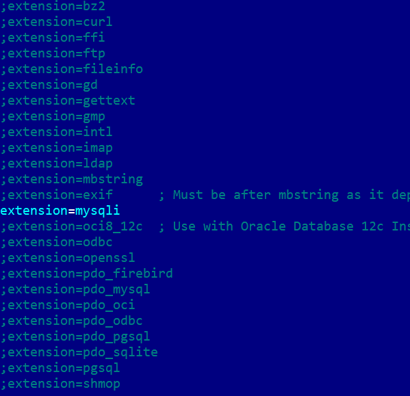 Но это ещё не всё. Мы указали только папку, а нужно ещё подключить расширение. Для этого сделайте поиск строки extension=, и вы попадёте в блок, где подключается много расширений, но все они закомментированы, то есть неактивны. Нужно убрать комментарий со следующей строчки, чтобы сделать расширение активным:
