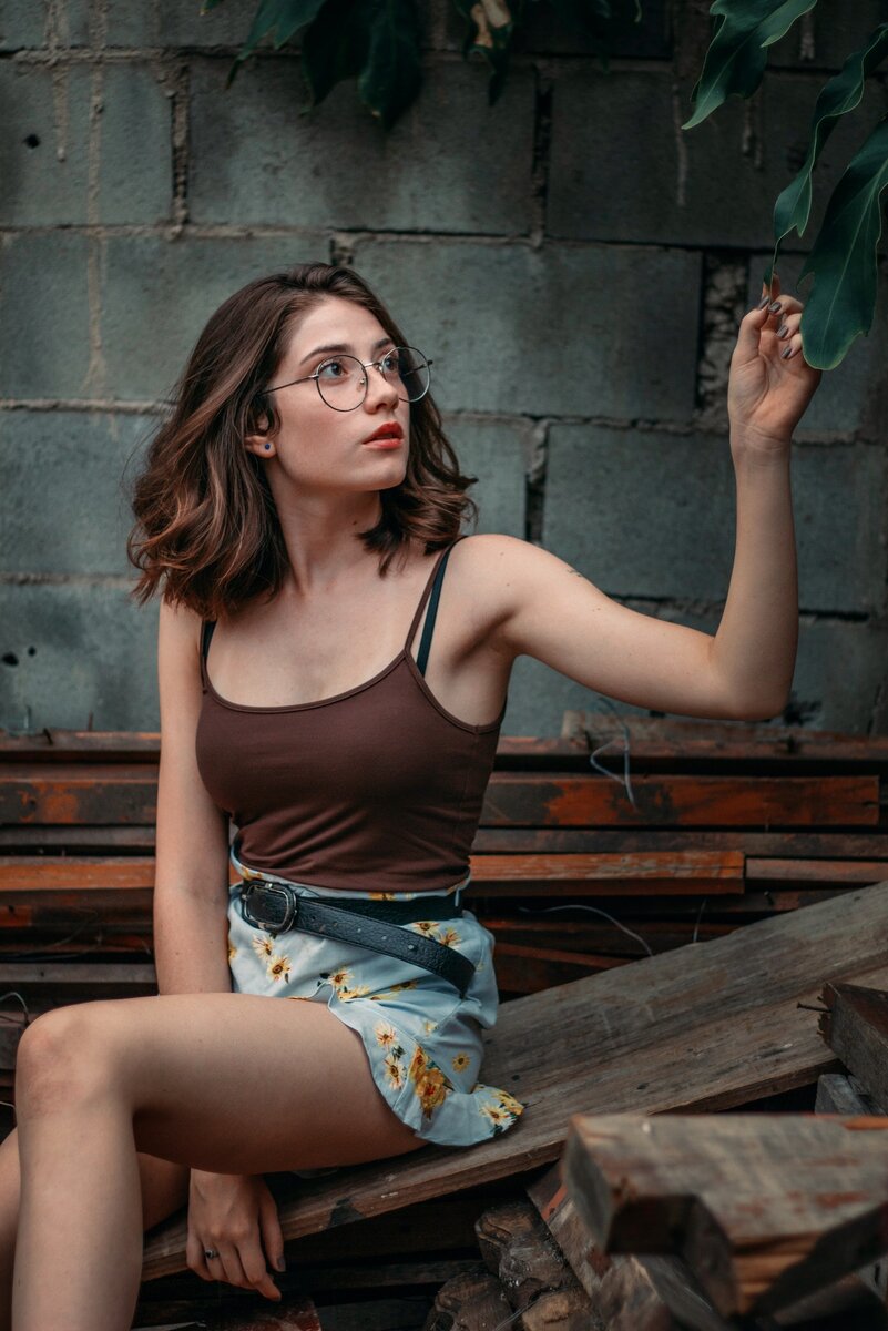 Молодая девушка в топе и юбке. Главным и единственным аксессуаром являются круглые очки. Модель рассматривает лист дерева.