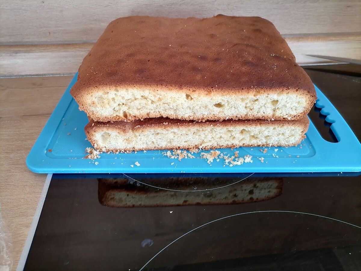 Начинаем сборку торта. Корж я поделила пополам и каждую половинку разрезала вдоль итого получилось 4 пластика. Каждый пластик пропитываем и прослаиваем кремом.
