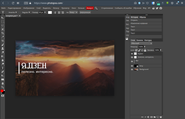 Если вы вбиваете в Google «фоторедактор онлайн», вы получаете кучу мусорных сайтов, где не работают даже элементарные функции. Но только не Photopea — это реально самая приближенная версия к Photoshop. Её создал какой-то чувак из Чехии, сервис при этом абсолютно бесплатен.