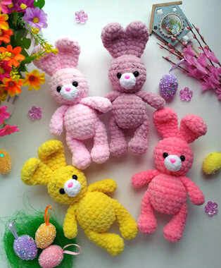 Бесплатный мастер-класс от Елены Степановой по вязанию плюшевого зайки по имени Прыг Скок. Высота вязаной крючком игрушки примерно 21 см вместе с ушками. Для изготовления зайчика автор использовал плюшевую пряжу Himalaya Dolphin Baby и крючок 4 мм, а также носик 10 мм и безопасные глазки 9 мм.