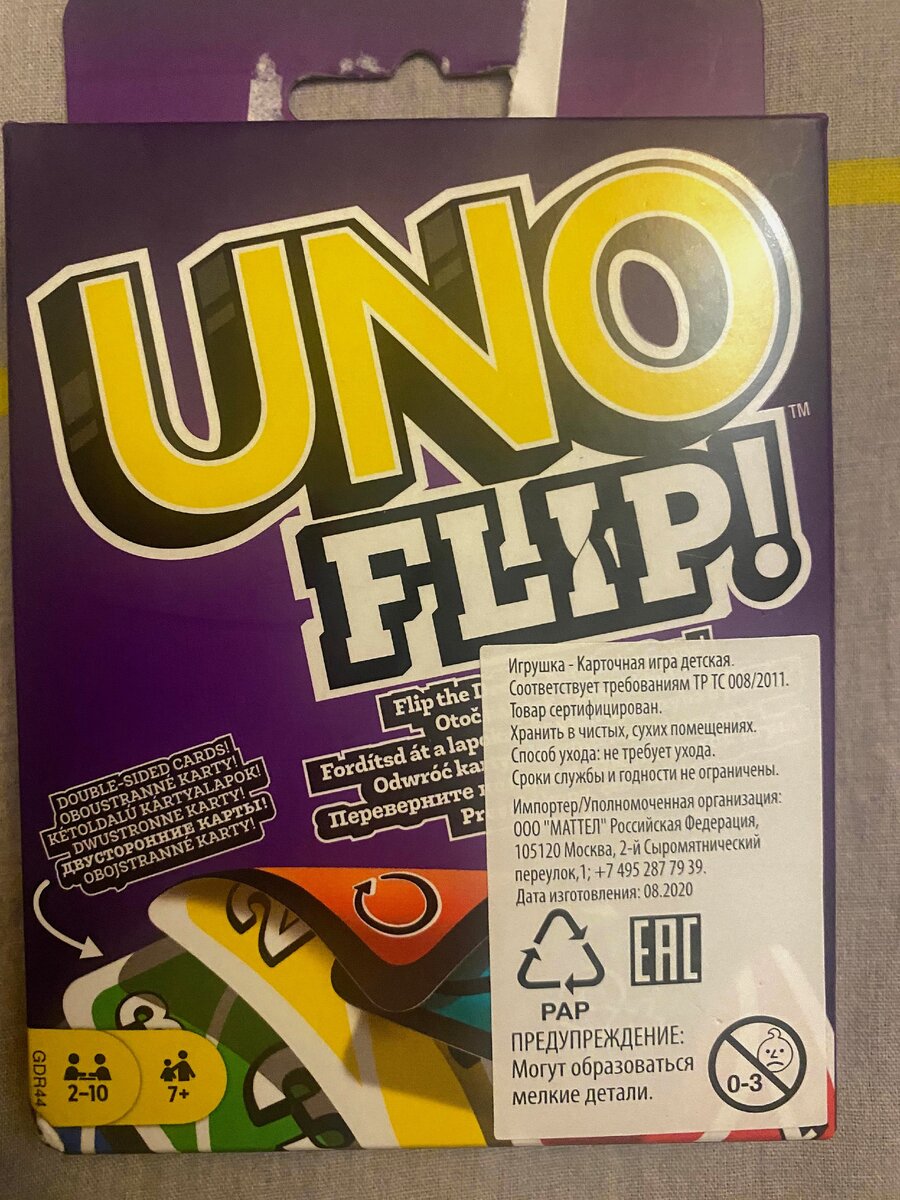 UNO – одна из самых известных игр. Очень простая карточная игра. Мне нравится именно UNO Flip тем, что карты двусторонние и к привычной игре (на карту, которая на столе с руки нужно положить карту либо с такой же цифрой, либо с таким же цветом) появляется еще карта, которая заставляет переворачивать карты и играть с другим набором.
