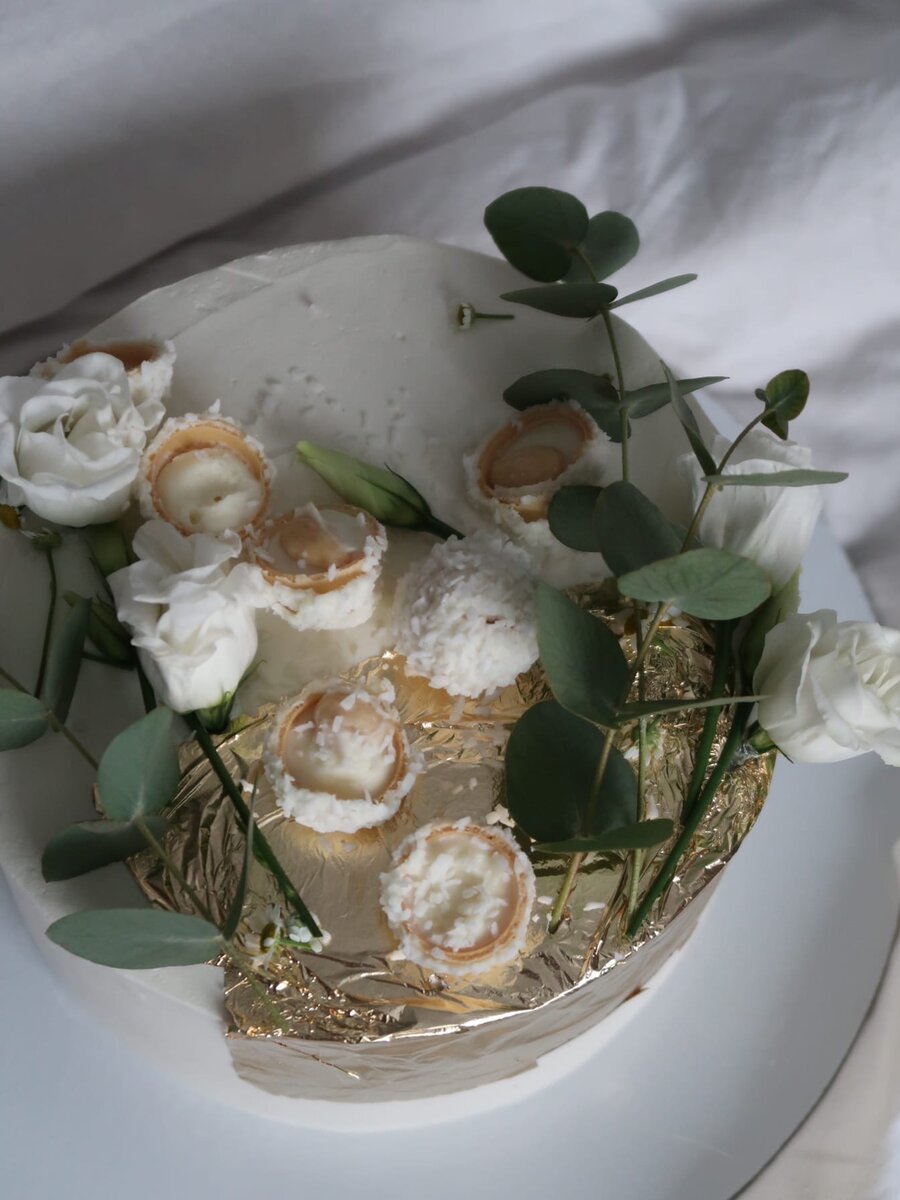 В качестве декора я использовала цветы и конфетки «Рафаелло».
