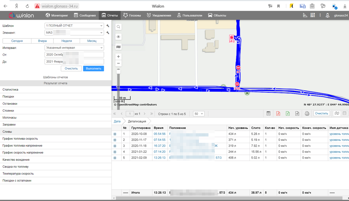 Следовательно, датчики уровня топлива «не замечали» сливов небольших объемов в виде уведомлений. Чего не сказать о графиках в отчетах – на них четко прослеживались падения уровня топлива.