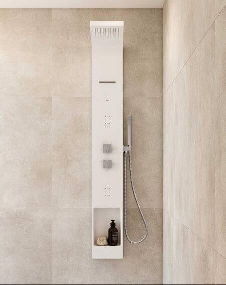 Гидромассажные форсунки термостатической душевой стойки Evolution , предназначенные для массажа области шеи и поясницы, создают уникальное ощущение комфорта, которое усиливается благодаря режиму каскада душевой насадки. Также для удобства вы можете добавить практичную дополнительную полку для размещения ваших банных принадлежностей.