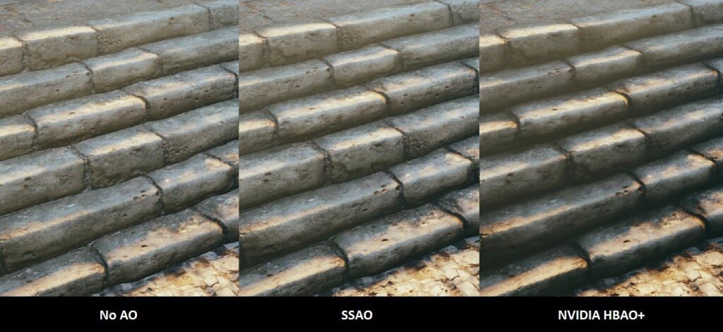 Технологии, позволяющие просчитывать освещение с учетом объектов, которые его преграждают. SSAO потребляет меньше ресурсов, работает в ограниченных областях и не так эффектно, как HBAO +, который делает картинку гораздо реалистичнее, но и гораздо более требовательный к вычислительной мощности.