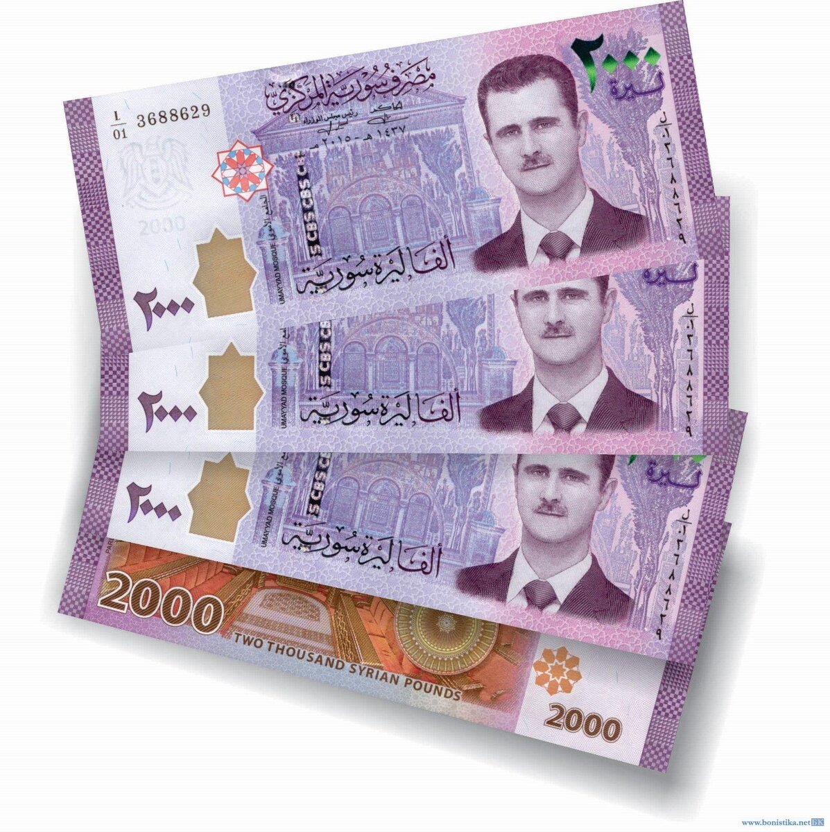 Новая двухтысячная имеет фиолетовенький цвет и на одной из ее сторон изображен Башар Асад. С другой стороны - парламент.