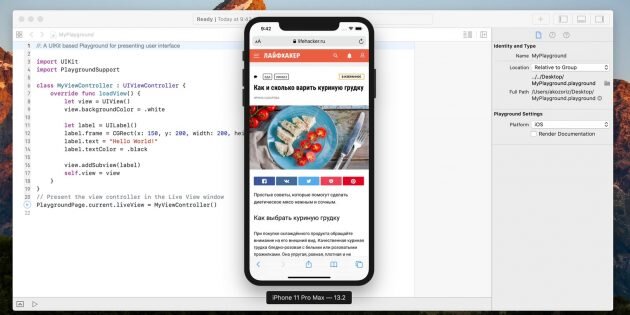 Симулятор запускается прямо из проекта Xcode. При этом даже здесь создается специально скомпилированная под архитектуру x86 версия для работы на Mac. Тестировать можно как проекты на Objective‑C или Swift, так и веб‑приложения — Simulator полностью воспроизводит внешний вид и поведение iOS на выбранном устройстве.