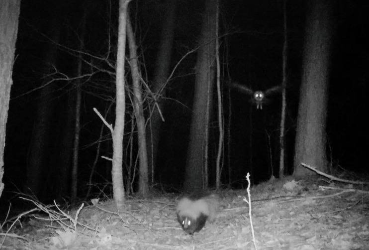 Фотоловушки позволяют исследователю заглядывать за кулисы мира природы. Тут в объектив попали сразу скунс и сова. Вероятно, пернатую привлёк шорох его лапок, но угрозу мистеру вонючке она не представляет.