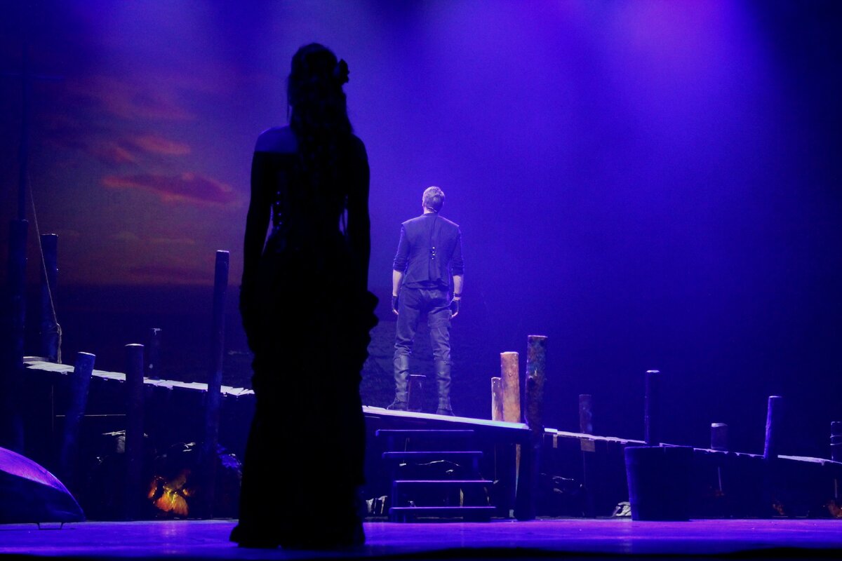 А вот оформление сцены понравилось: море, солнце/луна, причал, лодки. Хотя место действия - гостиница.
