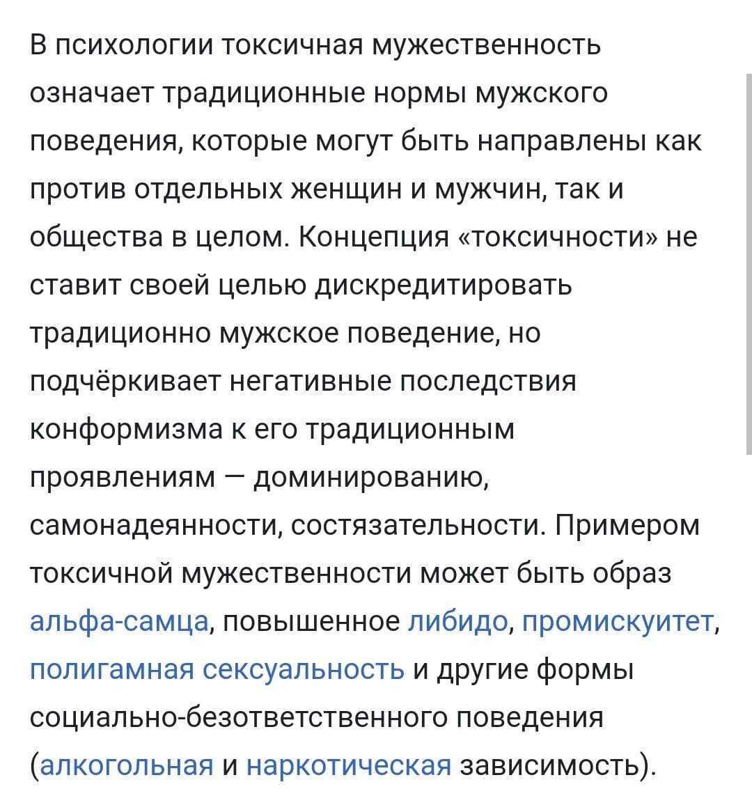 Обыватель в растерянности. Он гуглит и википедит. Его сознание отравлено мраком патриархального невежества, сквозь заросли которого пробиваются лучи прогрессивного света. И вот уже кладезь мировой информации сообщает ему, что под "токсичной мужественностью" подразумеваются «традиционные нормы мужского поведения, конформизм к которым ведёт к негативным последствиям». А это значит, что никакой лояльности к ним быть не должно.