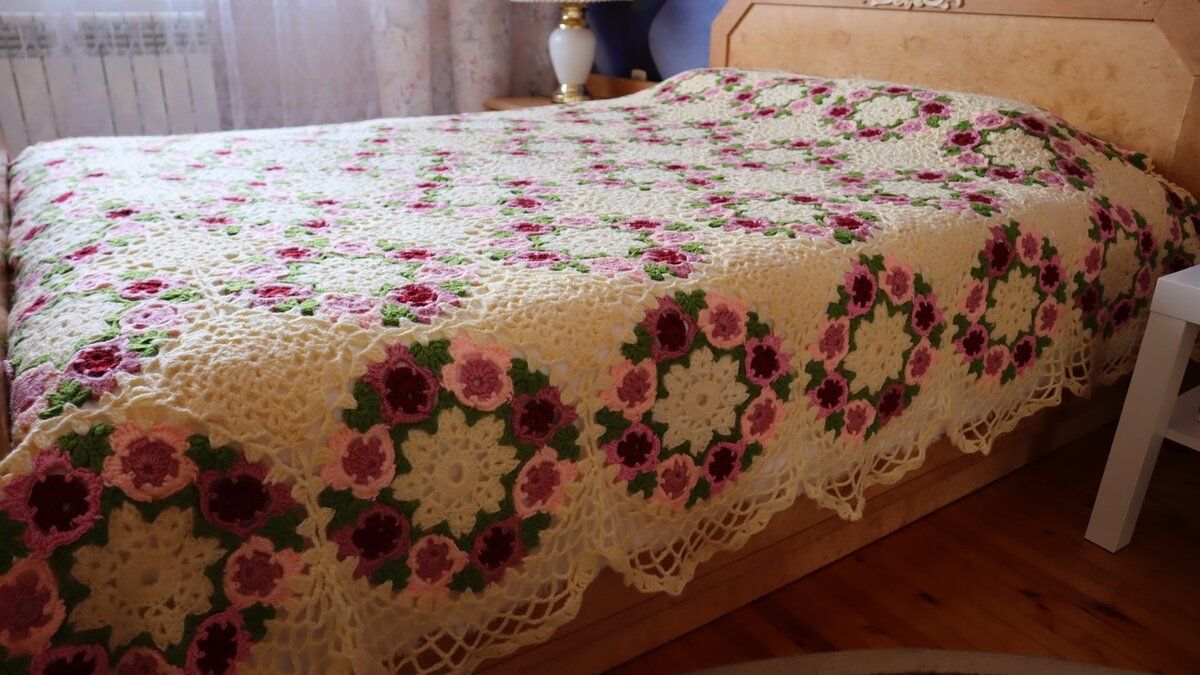 Такие изделия невозможно сделать в короткий срок, некоторые работы продвигаются долго, очень долго. У меня есть белое покрывало, которое я вязала 2 года.