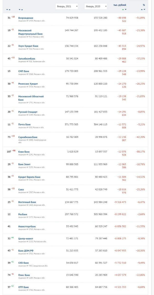 Физики прилично вынесли депозитов из розничных банков за прошлый год. Досталось группе ВТБ-Почта-банк (Саровбизнесбанк, Возрождение, Запсибкомбанк), но исход компенсировался притоком в головной банк. Также вкладчики ушли из принадлежащего ЦБ Минбанка и банков братьев Ротенбергов - СМП и Мособлбанка. В минусе Ренессанс, банк Восточный, ОТП, Русский Стандарт, Дом РФ. Мне кажется, что вообще очень