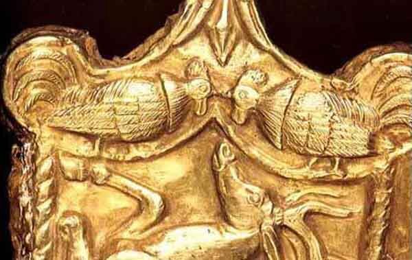 Обкладки ножен царского меча из кургана «Толстая могила» с золотыми петухами, готовыми к бою! Единственный такой сюжет, дошедший до нас от скифов.