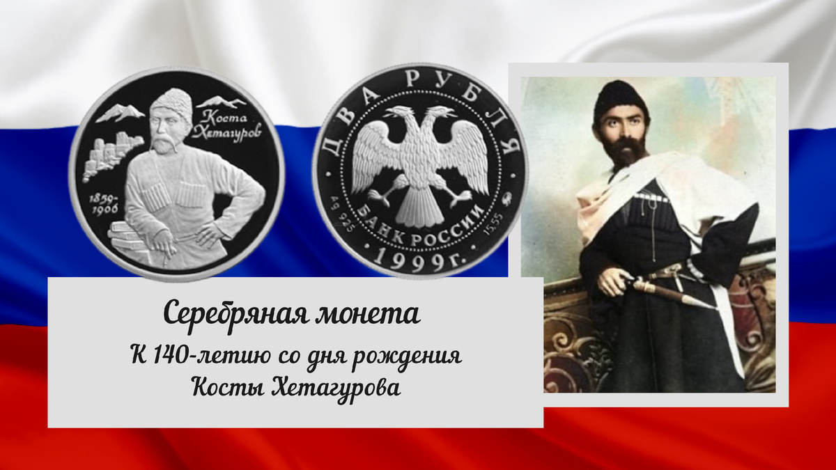 В 1999 году Банк России выпустил в обращение серебряную памятную монету номиналом 2 рубля. Монета посвящена 140-летию со дня рождения Косты Хетагурова, входит в серию "Выдающиеся личности России". Тираж данной монеты - 3000 экземпляров.
