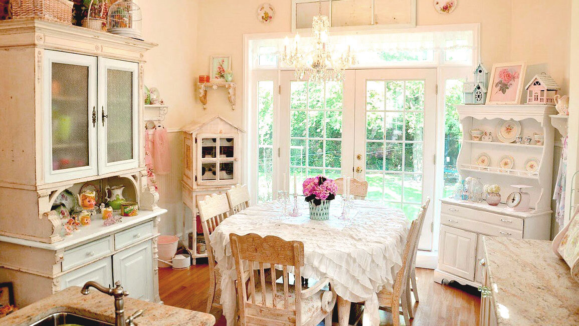 Этому стилю присуще обилие текстиля: занавески, шторы, салфетки и полотенца. Основная цветовая гамма — пастельные нежные оттенки с вышивкой растительного орнамента или тонкой, чуть видной полоской.