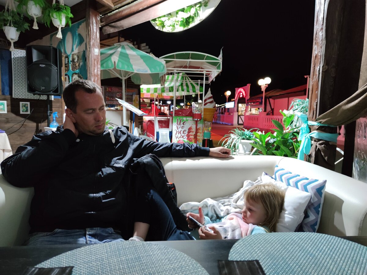 Пока ждали, чем еще занять ребенка, дали телефон. Спросили пароль от вай фая и включили мультик. Это взрослые могут спокойно сидеть, смотреть вдаль, любоваться пейзажем, мило беседовать.