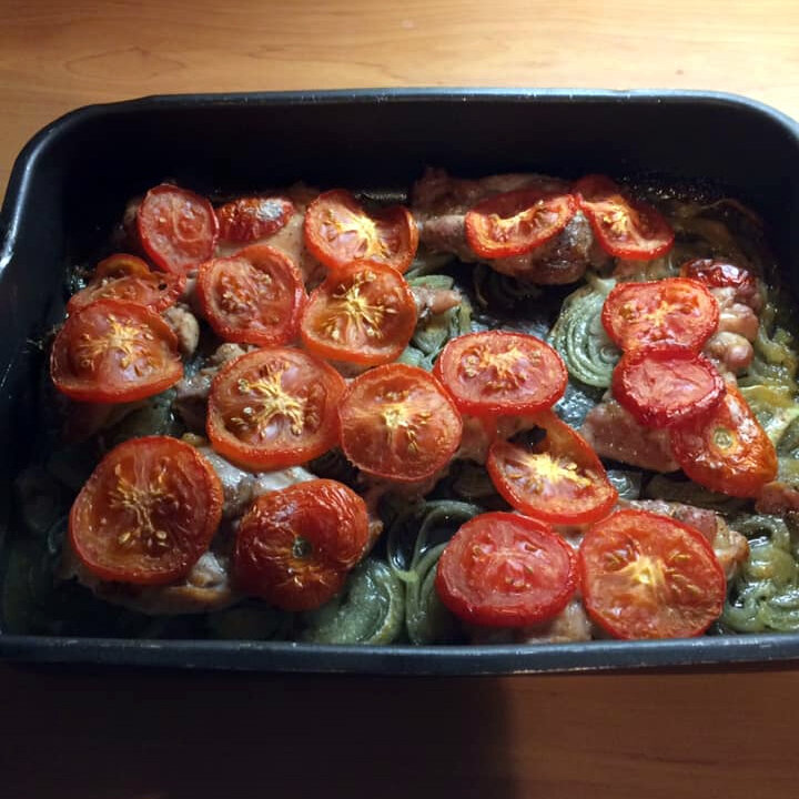Две больших луковицы нарезал полукружками, и сделал на дно противня луковую подушку Сверху выложил курочку, и накрыл порезанными кругляшками помидорами.