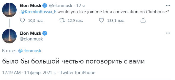 Илон Маск в своём твиттере опубликовал сообщение, адресованное В.В. Путину, в котором пригласил Президента России пообщаться в американской #соцсети с функцией аудиочата #clubhouse