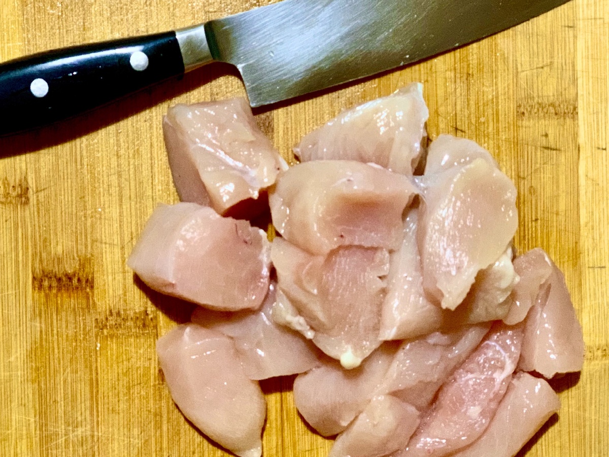 Режем грудку на крупные кусочки, как показано на фото. Можно поджарить грудку и целиком. главное-не пересушить.